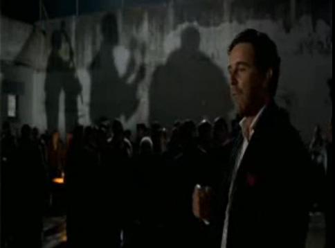Les prediqué mi anarquismo, lo que me salió de dentro (el gesto del predicador cambia, parece querer advertir que va a contar algo transcedente, y, quizá, peligroso; se difumina la profundidad de campo para hacer más nítidas las palabras retadoras, corte y plano medio del fantasma… es casi un primer plano conformado por el contraste de luz que se focaliza en el rostro… ese gesto… Luis Tosar despliega una intensa y asombrosa ambigüedad que nos informa del choque trágico de sentimientos encontrados, por un lado la autoridad que parece desafíada, y, por otro, algo así como el deseo de saber, de comprender esas palabras tan extrañas, pero que parecen transportar verdades como puños, verdades peligrosas)