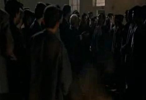 Eh, predicador… ¿cómo te va? Salud Pablo ¿Por que te llaman predicador? Eso viene de una vez en vísperas de elecciones, cuando andaban los curas dando esos sermones contra la izquierda, parecía el Apocalipsis (están presos, están vencidos, pero mantienen el discurso) anunciaban que si ganaba la República habría plagas (el personaje que habla se anima y adorna su relato con un andar didáctico) y que sacaríamos de procesión a Bakunin en lugar de a la Virgen (permanece la composición angular centrada en el hablador y extendida en la profundidad que permite ver ese contexto miserable de patio carcelario en el que sombras de seres humanos desvalidos parecen destinados a llenar el vacío de un mundo inhóspito y derrotado, a llenarlo, sí, con su digna derrota que conserva el lenguaje y la mirada). Así que un día me vestí de fraile y me planté en una iglesia llena de beatas. El cura todavía no había llegado, fui al púlpito y tomé la palabra. ¿Y qué dijiste? (La escena va a subir de tensión, el plano general pasa a plano medio para obligarnos a concentrarnos en el mensaje del predicador que quiere aumentar la tensión ideológica).